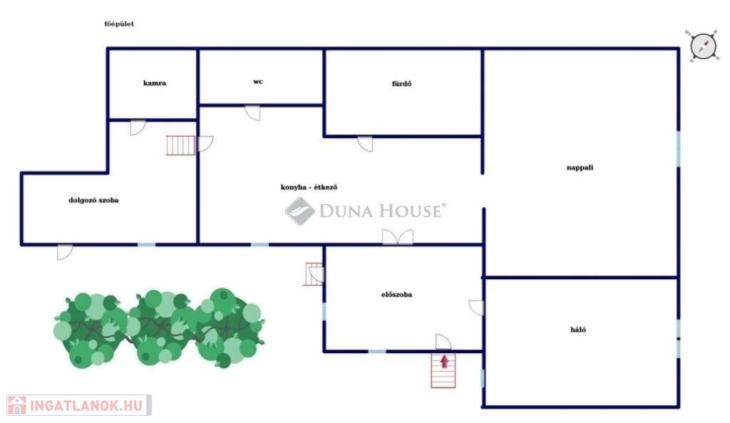 Nappali, háló, konyha-étkező, kamra, fürdő, előszoba