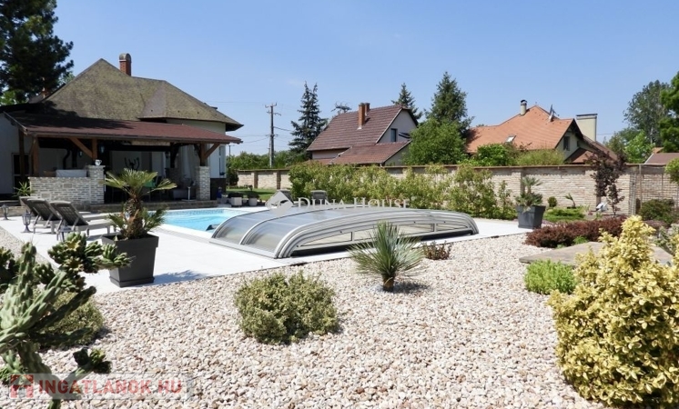 A házhoz egy sós vizű, lefedhető medence is tartozik, amely inverteres fűtéssel rendelkezik. A medence vízminőségét és működését egy különálló gépház biztosítja, amely a tisztító- és keringetőrendszert kezeli. A kert rendezett, automata öntözőrendszerrel, konyhakerttel és automata fűnyíróval felszerelt.