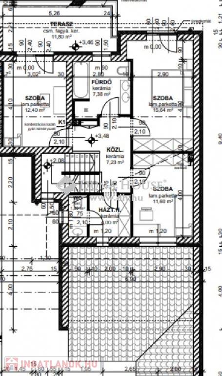 3 hálószoba (12,40, 15,64, 11,60), fürdőszoba, háztartási helyiség, emeleti terasz
