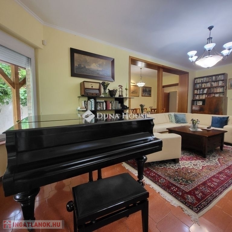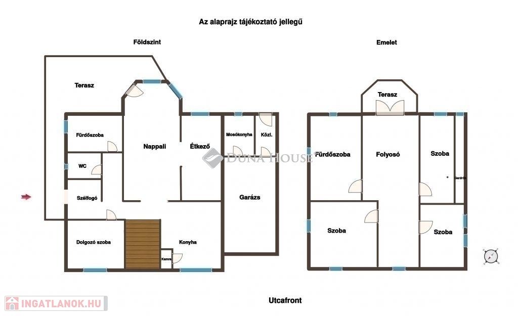Földszint: impozáns előtér és közlekedő, nappali közvetlen teraszkapcsolattal, dupla konyha étkezővel, spájz, egy szoba, fürdőszoba WC-vel, külön vendég-WC.