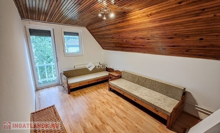 A földszinten tágas nappali, részben szeparált, teljesen gépesített konyha (indukciós főzőlap, mosogatógép, külön hűtő, mikró), valamint fürdőszoba épített zuhanyzóval és külön WC található. Az emeleten a tetőtérben egy társalgótérből nyílik három külön bejáratú hálószoba és egy második fürdőszoba WC-vel és nagyméretű, 90x90-es sarokzuhanyzóval.