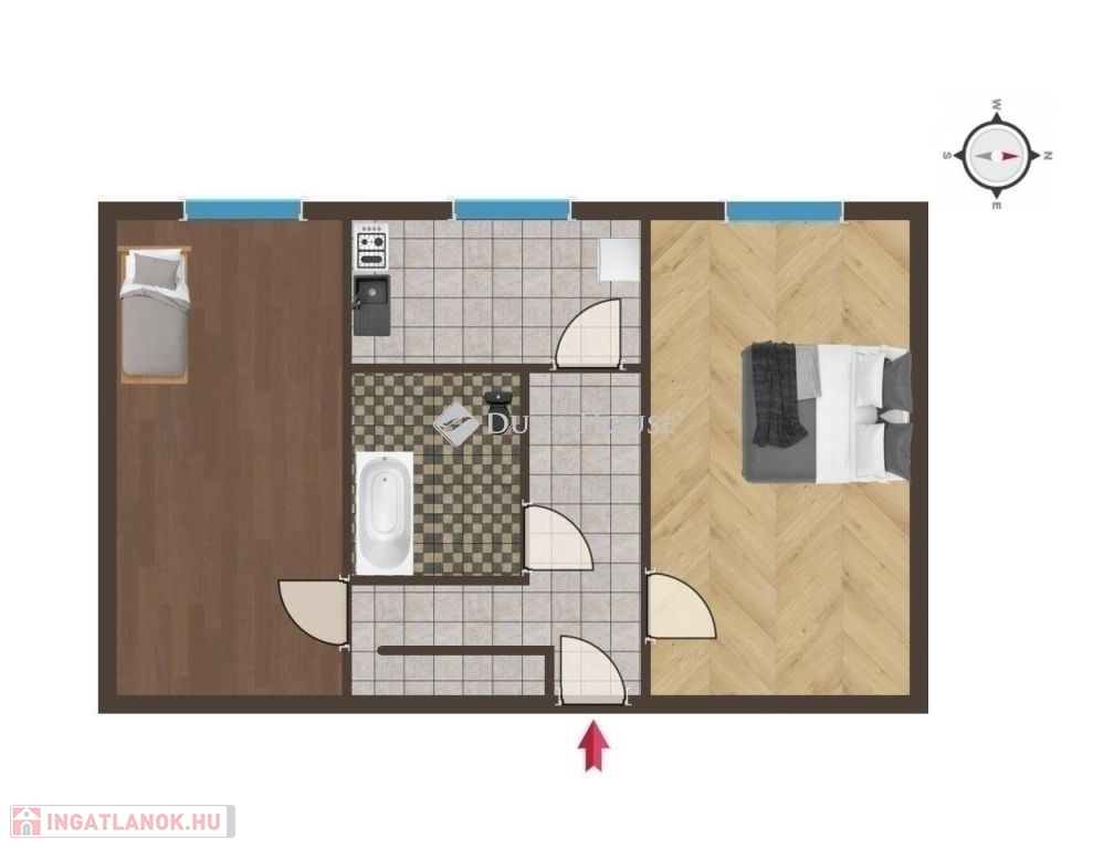 - Alapterület: 47 m2, két külön nyíló szobával;