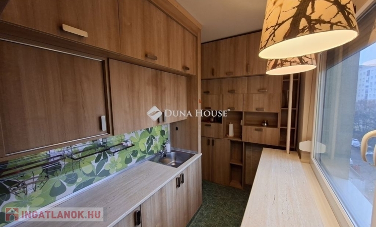 - világos, jó fényviszonyokkal rendelkező konyha van, mely plafonig érő, beépített szekrénysorral rendelkezik